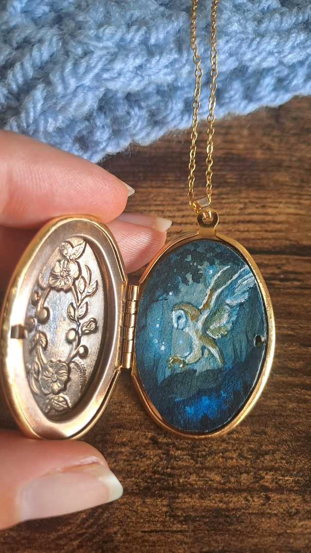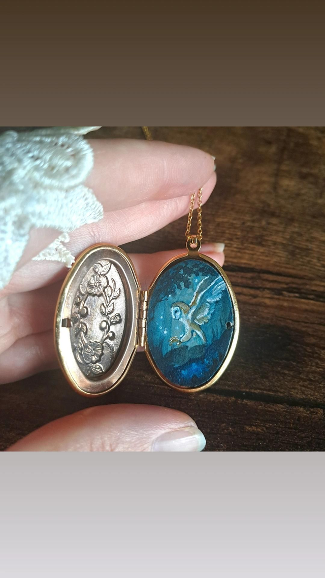 Aquarelle originale vernie, signée au dos puis encollée dans son bijou locket. Il sagit d'un très beau médaillon en laiton de 3,8cm de haut L'aquarelle délicate peinte à l'intérieur mesure 3cm, c'est une pièce unique originale.