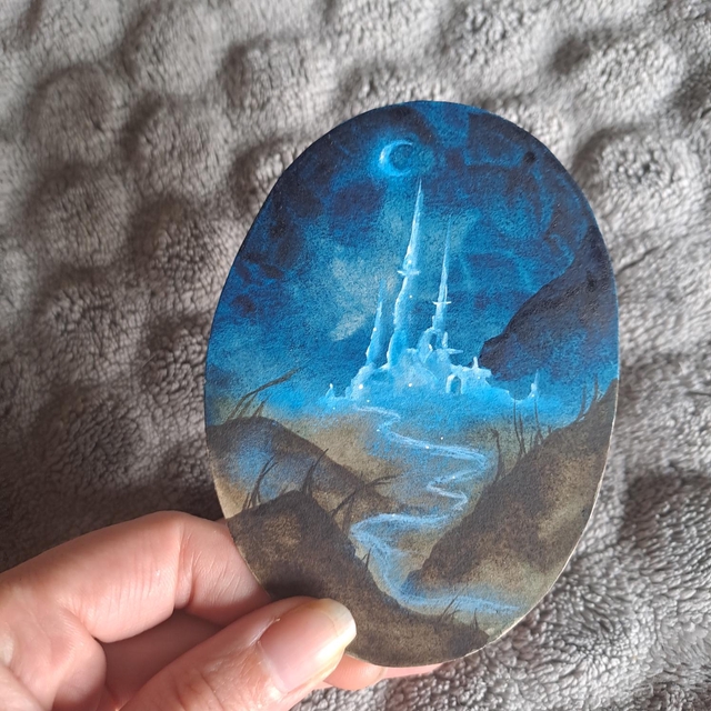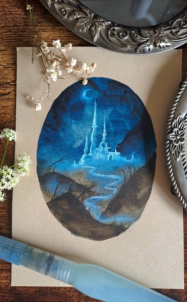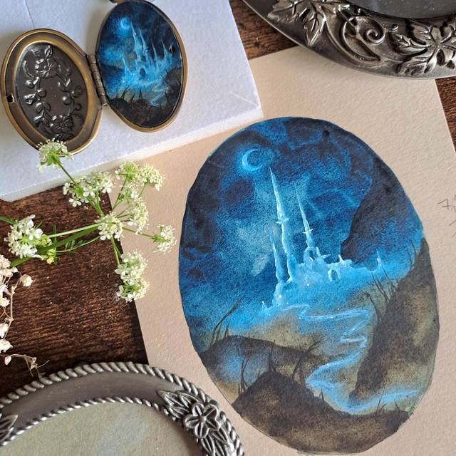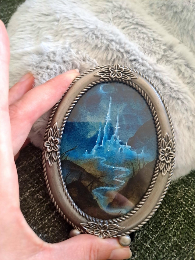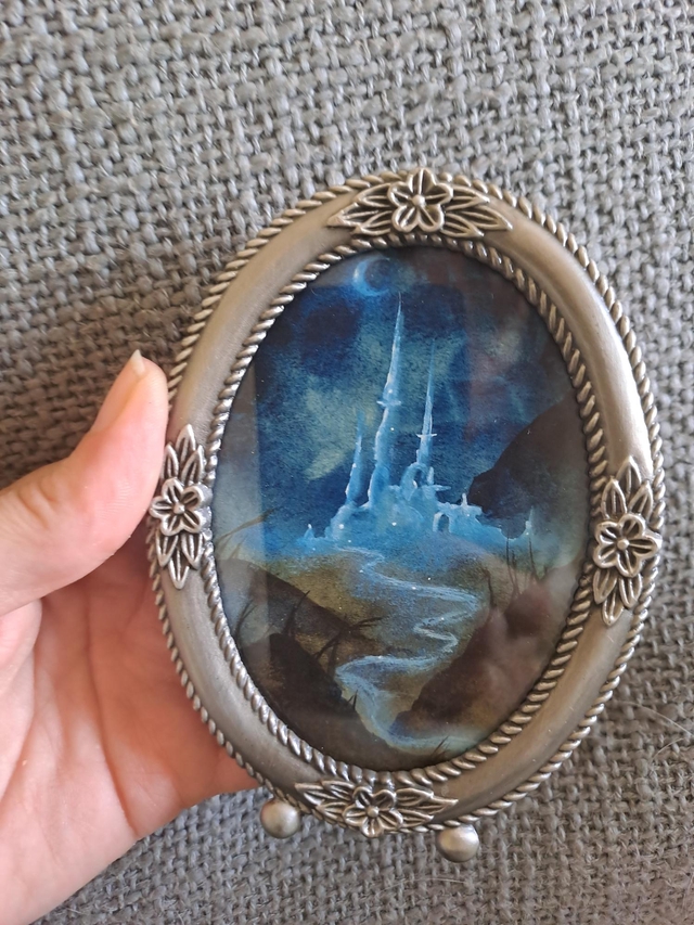 Château féerique des contrées de Lunarheen au clair de lune Aquarelle originale signée par les fées Véritable cadre ancien en étain sculpté Avec dos en velours