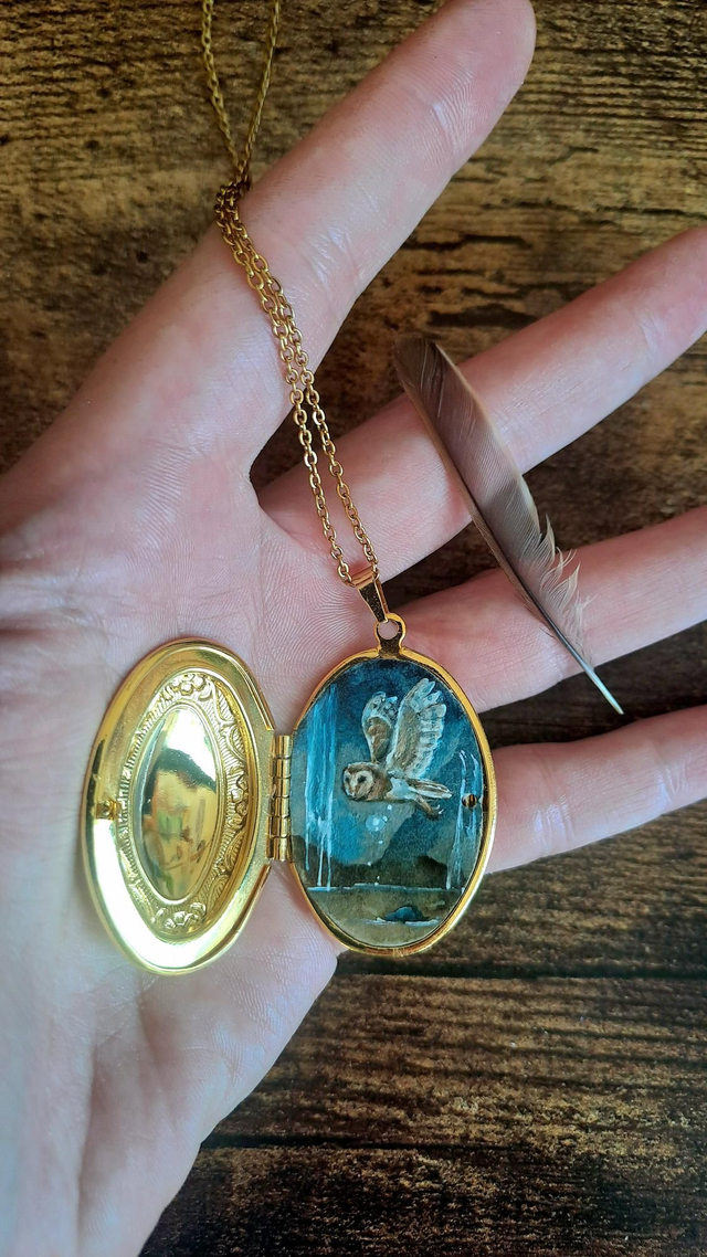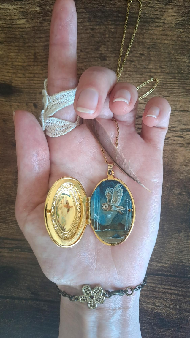 Aquarelle originale vernie, signée au dos puis encollée dans son bijou locket. Il sagit d'un très beau médaillon en laiton de 3,8cm de haut L'aquarelle miniature délicate peinte à l'intérieur mesure 3cm.